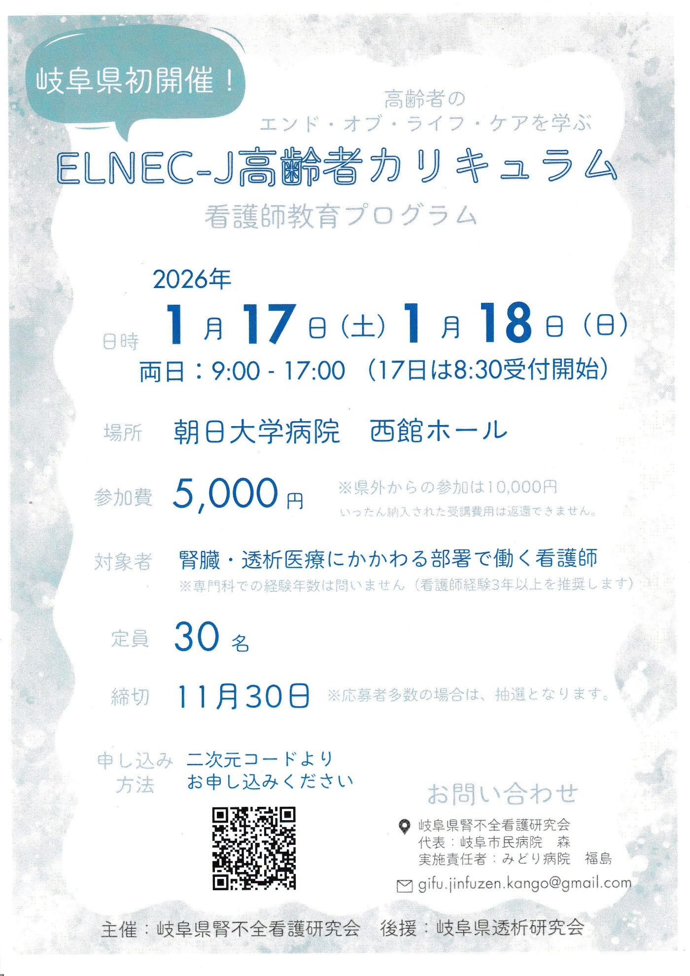 【2026/1/17.18】岐阜県腎不全看護研究会 ELNEC-J高齢者カリキュラムのご案内