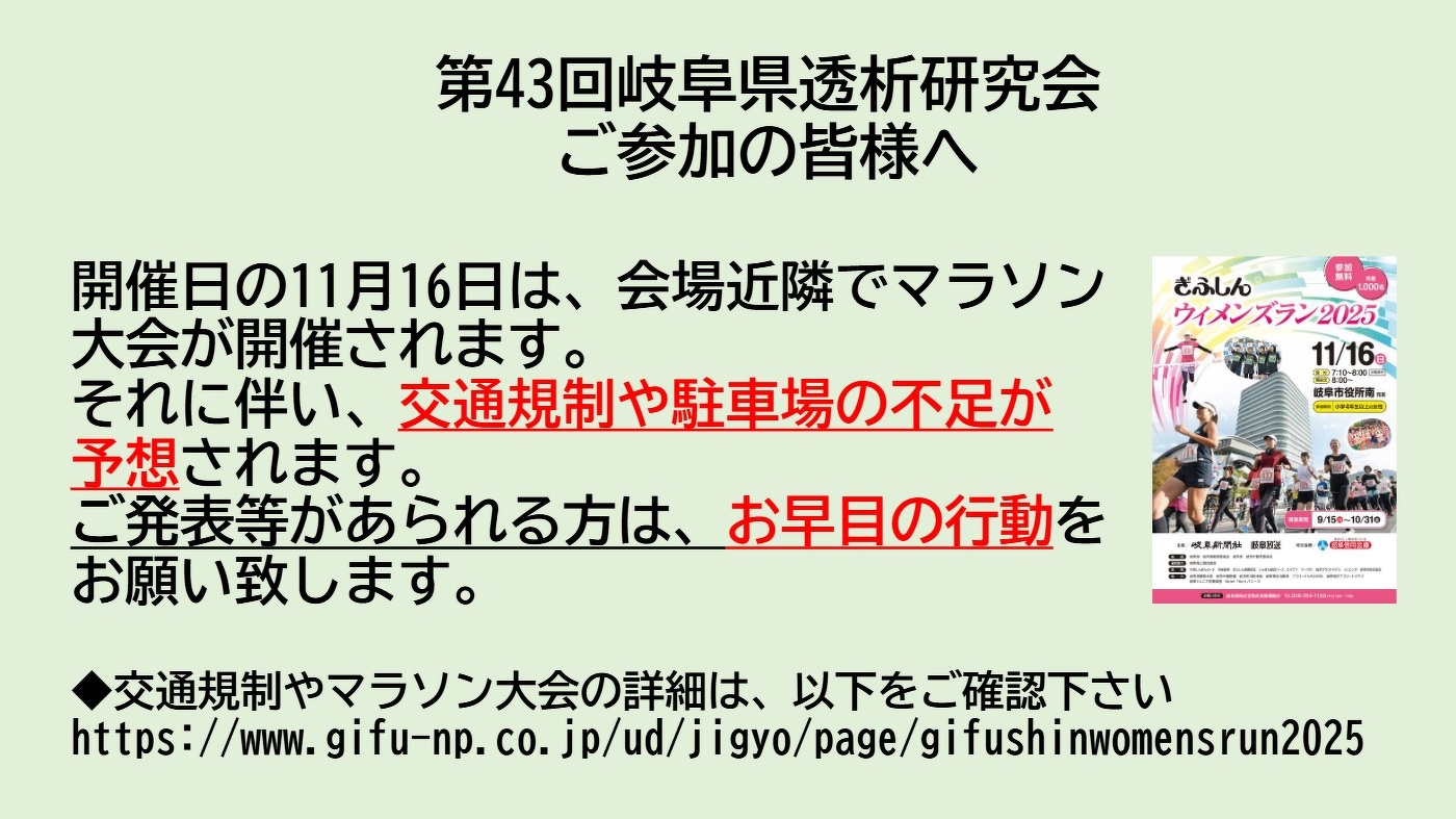 「第43回岐阜県透析研究会」ご参加の皆様へ 事務局より Date 2025.10.28 第43回岐阜県透析研究会の開催日の11月16日は、会場近隣でマラソン大会が開催されます。 それに伴い、交通規制や駐車場の不足が予想されます。 ご発表等があられる方は、お早目の行動をお願い致します。 ◆交通規制やマラソン大会の詳細は、以下をご確認下さい。 ぎふしん ウィメンズラン 2025 https://www.gifu-np.co.jp/ud/jigyo/page/gifushinwomensrun2025 前へ 一覧へ