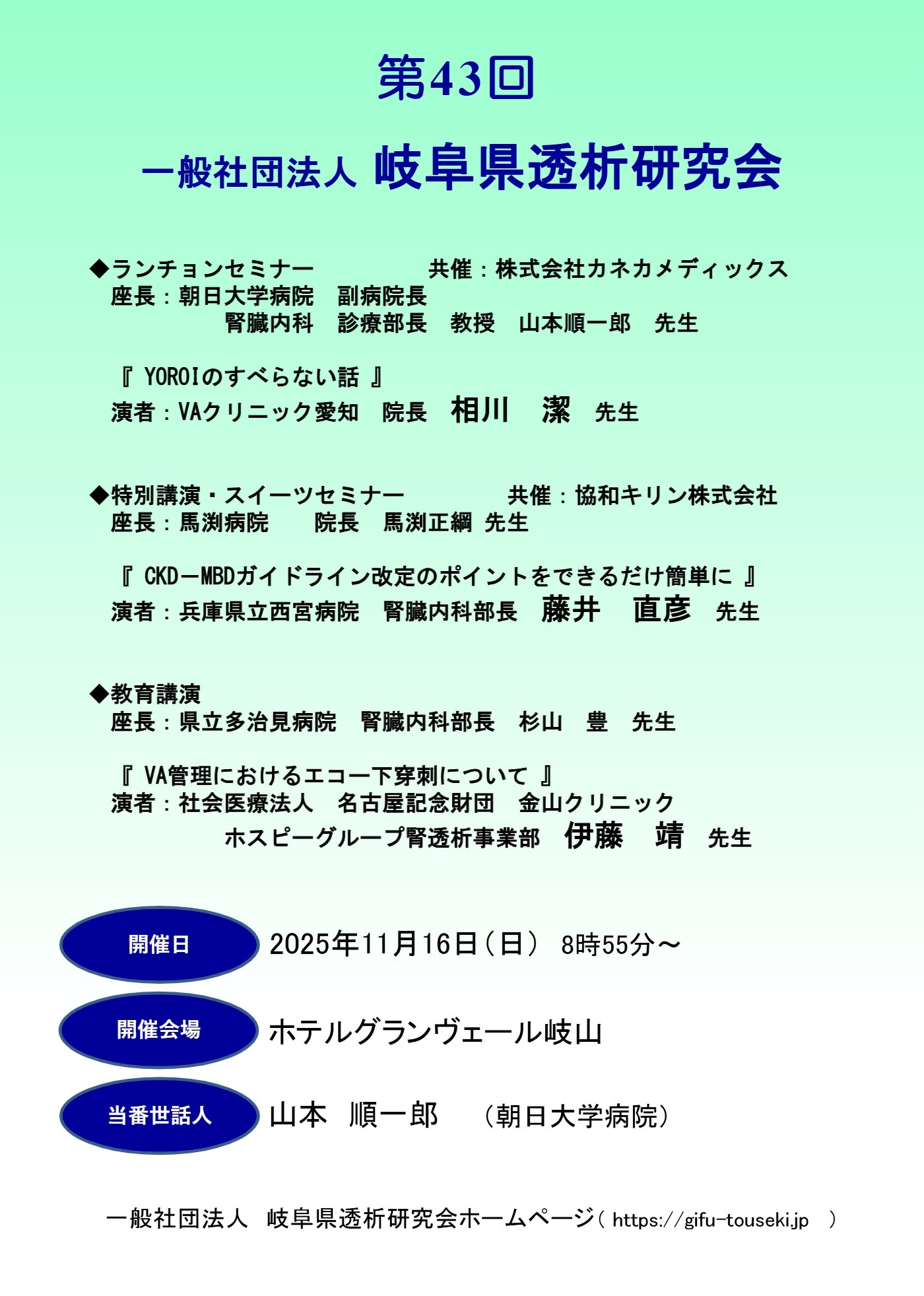 「第43回岐阜県透析研究会」ランチョンセミナー、特別講演・スイーツセミナー、教育共演のご案内