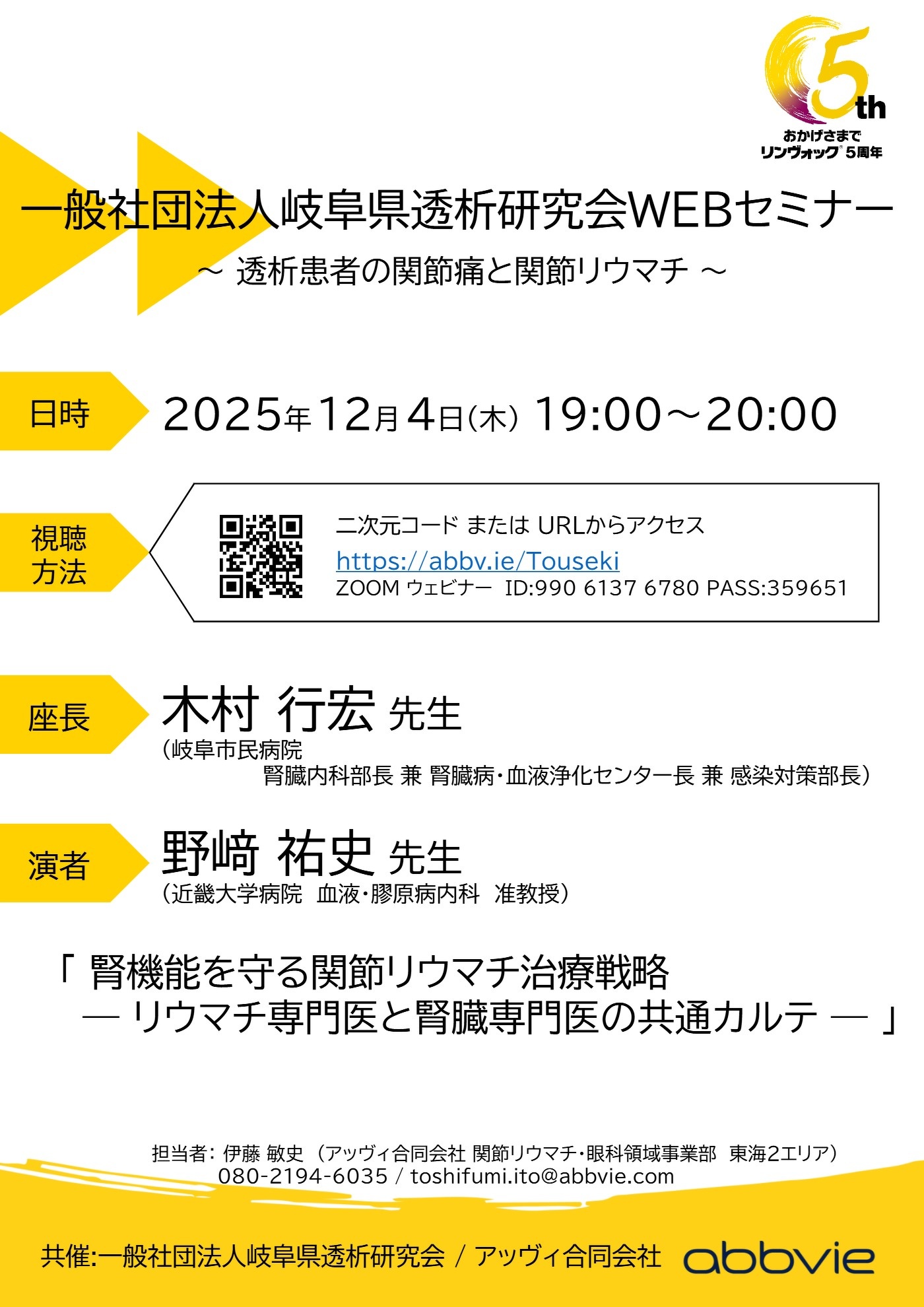 【2025/12/4】一般社団法人岐阜県透析研究会 WEBセミナー<透析患者の関節痛と関節リウマチ>
